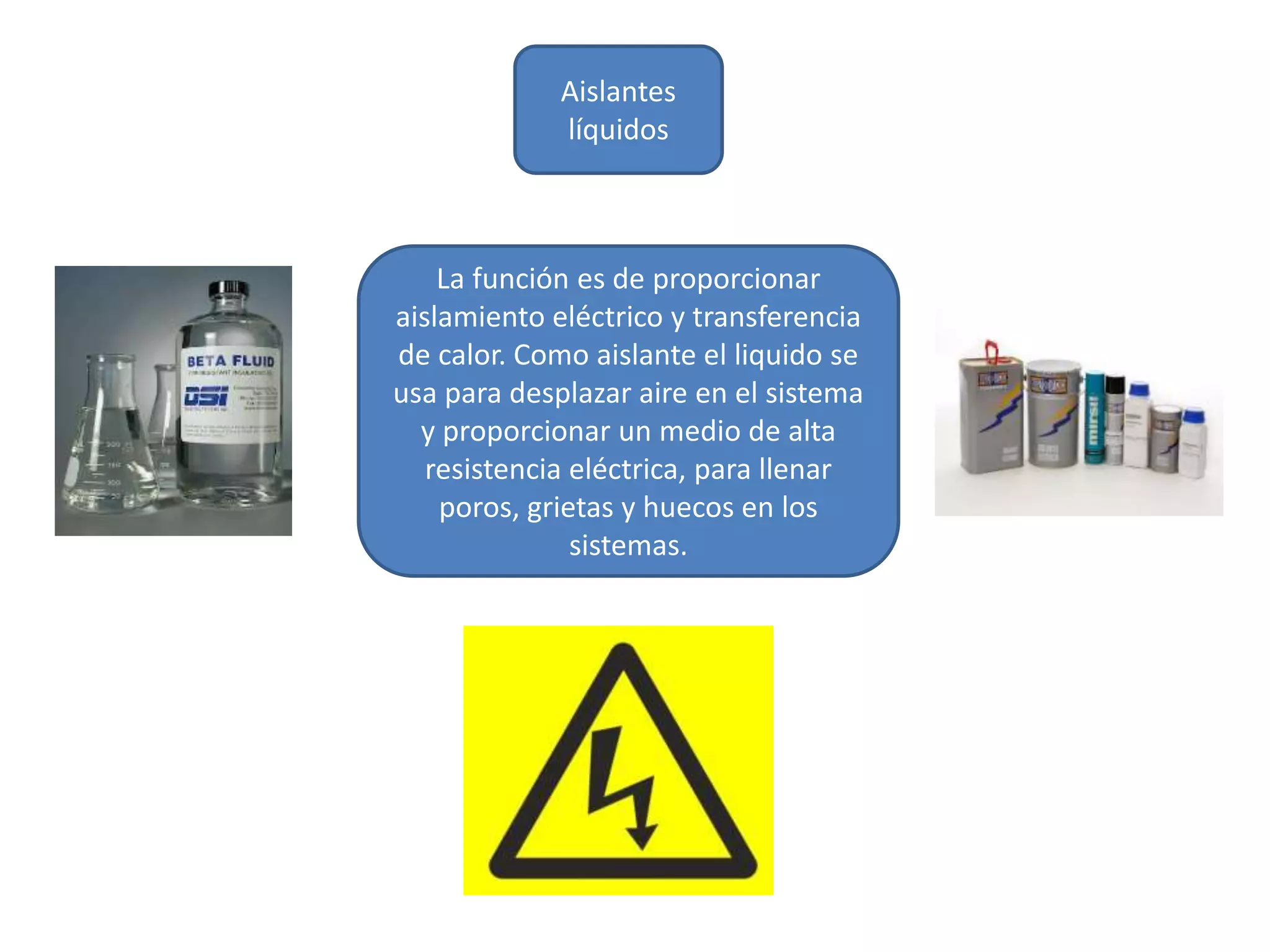 Este documento describe las propiedades y usos de los aislantes líquidos. Explica que los aislantes líquidos se usan para proporcionar aislamiento eléctrico y transferencia de calor al desplazar el aire. Detalla algunas de sus propiedades eléctricas como su conductividad iónica y rigidez dieléctrica, así como propiedades físico-químicas como viscosidad, puntos de inflamación y congelación. Finalmente, indica que los aislantes líquidos se utilizan para llenar esp
