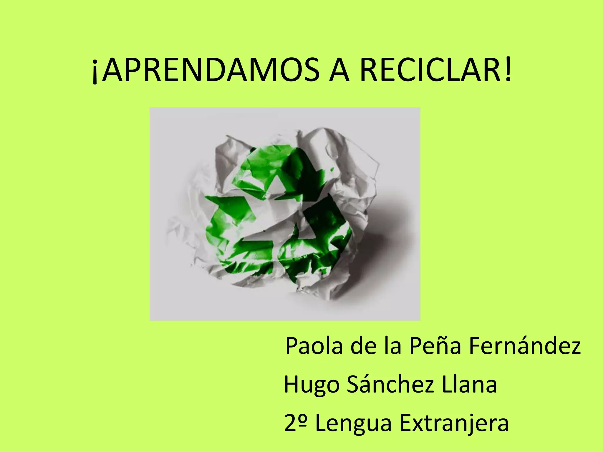 El documento presenta un proyecto escolar sobre reciclaje. Los estudiantes trabajarán en grupos para investigar las tres erres de reducir, reutilizar y reciclar, elaborar un plan de reciclaje aplicable a la vida diaria, y presentarlo oralmente ante la clase con apoyo tecnológico. El documento proporciona enlaces a sitios web para que los estudiantes obtengan información sobre las tres erres y desarrollen su plan de reciclaje.