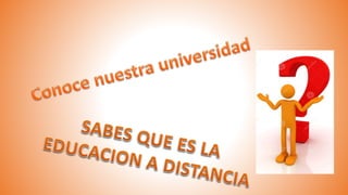 El documento describe la educación a distancia como una alternativa de formación que permite alcanzar la formación integral utilizando estrategias y recursos de enseñanza y aprendizaje flexibles. Ofrece oportunidades educativas a quienes les es difícil asistir a clases presenciales debido a limitaciones de tiempo, ubicación geográfica u otras razones. El aprendizaje a distancia depende de la autonomía e independencia del estudiante y se apoya en las tecnologías de la información y la comunicación.