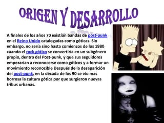 El documento resume el origen y desarrollo de la subcultura gótica desde finales de los años 70 hasta la actualidad. Comenzó como un subgénero del post-punk en los años 80 y se ha mantenido popular desde entonces, aunque ha evolucionado y se ha vuelto menos definido con el tiempo. La cultura gótica se centra en la estética oscura, las influencias de la ficción de terror y el ocultismo, y promueve el individualismo y la tolerancia más que cualquier mensaje político. A pesar de su énfasis en la diversidad, la