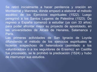San Ignacio de Loyola fundó la Compañía de Jesús después de experimentar una conversión religiosa tras resultar herido en la batalla. Reunió a seis compañeros con los que hizo votos de pobreza y apostolado. El Papa aprobó la nueva orden religiosa en 1540, con Ignacio como su primer general. La Compañía de Jesús se dedicó a la enseñanza, el apostolado y las misiones católicas en Europa y América.
