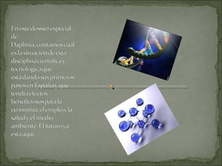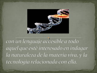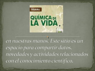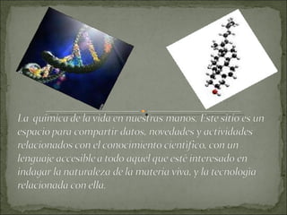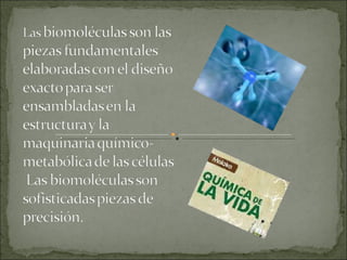 El documento describe cómo la naturaleza ha creado a través de la evolución las biomoléculas esenciales para la vida, como sustancias básicas que construyen, conservan y reparan las células y tejidos. Las biomoléculas son la materia prima de los seres vivos y presentan una afinidad entre las especies vivas, los alimentos naturales y el cuerpo humano. Además, señala que aunque estamos rodeados de muchos tóxicos dañinos, la química y la vida no tienen por qué