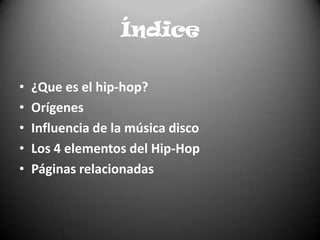 El documento habla sobre la cultura del hip-hop, incluyendo sus orígenes en las comunidades afroamericanas y latinas de Nueva York a finales de los 1960s. Explica los cuatro elementos fundamentales del hip-hop según Afrika Bambaataa: el MCing (rapeo), DJing (disc-jockey), breakdancing, y graffiti. También discute la influencia de la música disco y define cada uno de los cuatro elementos.