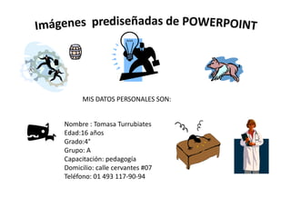 Este documento presenta los datos personales de Tomasa Turrubiates, una estudiante de 16 años que cursa el 4° grado de pedagogía. Incluye su nombre, edad, grado, grupo, domicilio y número de teléfono. También menciona algunos términos relacionados con el fútbol como práctica sencilla, nombres de equipos y objetos como la bandera y el balón.