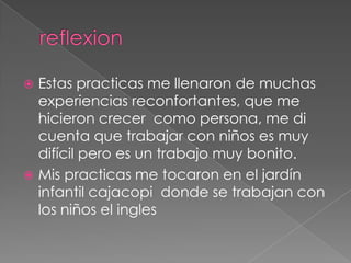 Este documento resume las prácticas de un estudiante en el Jardín Infantil Cajacopi, donde aprendió que trabajar con niños es difícil pero gratificante. El jardín celebró su 11o aniversario con el apoyo de Cajacopi. Siguiendo su cronograma, el jardín celebrará el Día de las Madres y del Trabajador con actos para las madres y empleados. Finalmente, el mes concluirá con la segunda English Week para enseñar inglés.
