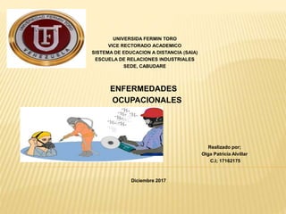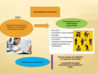 Las enfermedades ocupacionales son aquellas que se adquieren o desarrollan en el puesto de trabajo. Un documento realizado por Olga Patricia Alvillar para la Universidad Fermin Toro describe las enfermedades ocupacionales y sus características, incluyendo los factores que las determinan.