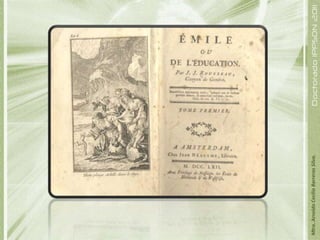 Jean-Jacques Rousseau fue un filósofo y escritor francés cuyas ideas influyeron en la Revolución Francesa. En su obra Emilio o De la educación, Rousseau propuso una nueva visión de la educación basada en la naturaleza del niño y el desarrollo por etapas. Criticó la educación de su época por alejarse de los intereses naturales del niño y ser demasiado verbal y libresca. En su lugar, propuso una educación basada en la observación, experimentación y libertad para descubrir el