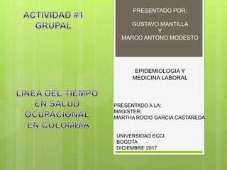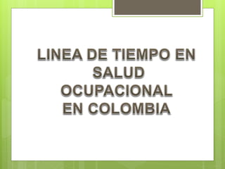 El documento resume la evolución histórica de la legislación colombiana en materia de salud ocupacional desde 1915 hasta 2015. Algunos hitos clave incluyen la primera ley sobre accidentes de trabajo en 1915, la creación del Instituto Colombiano de Seguros Sociales en 1946, la inclusión de normas de salud ocupacional en el Código Sustantivo del Trabajo en 1950, y la creación del término "salud ocupacional" en 1979. La legislación ha ido actualizándose con resoluciones y decretos para regular aspectos como los programas