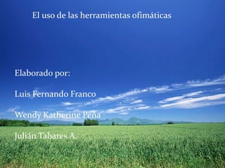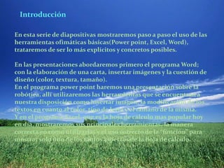 Este documento proporciona una introducción al uso básico de las herramientas ofimáticas Microsoft Office Word, PowerPoint y Excel. Explica cómo crear y compartir documentos, presentaciones y hojas de cálculo en la nube y describe algunas de las funciones y pestañas principales de cada programa, como insertar imágenes, modificar texto y usar funciones en Excel.