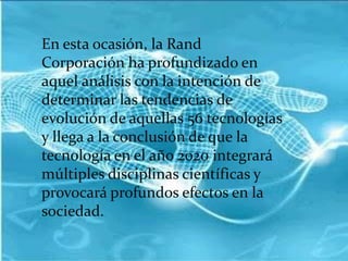 El documento describe cómo la convergencia de múltiples disciplinas tecnológicas tendrá profundos efectos en la sociedad en 2020. Identifica al menos 16 campos tecnológicos que convergerán, incluyendo energía solar barata, comunicaciones inalámbricas, dispositivos móviles, y cosechas genéticamente modificadas. Esta convergencia tecnológica permitirá aplicaciones médicas avanzadas para controlar enfermedades y desarrollar medicamentos de manera más efectiva.