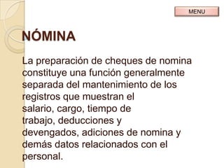 El documento resume conceptos clave relacionados con la nómina de un empleado como devengos, deducciones, prestaciones, prima, vacaciones, cesantías e intereses sobre cesantías. Explica que la nómina incluye salario, deducciones y prestaciones de un empleado y que los devengos son ingresos ganados aunque no cobrados. También define las deducciones, prestaciones como primas y vacaciones, y explica que las cesantías son un mes de sueldo por año trabajado y los intereses que se pagan sobre estas.