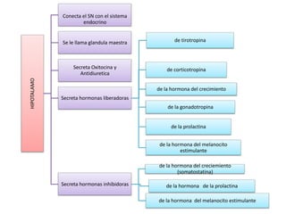 El sistema endocrino está compuesto de glándulas que secretan hormonas y el hipotálamo, que conecta el sistema nervioso con el endocrino. Algunas glándulas principales son la tiroides, la hipófisis, el páncreas y las suprarrenales, las cuales secretan hormonas como la tiroxina, la insulina y el cortisol para regular funciones vitales. El hipotálamo controla las glándulas a través de la liberación de hormonas estimulantes y inhibidoras.