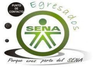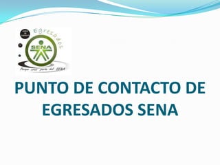 El Punto de Contacto de Egresados SENA surgió en 2008 para establecer un vínculo con los egresados y apoyar su desempeño laboral. Su misión es ofrecer oportunidades socio-laborales a los egresados a través de herramientas para el crecimiento personal y profesional. Su visión es tener cobertura nacional e internacional para 2013 y brindar servicios de alta calidad. Su objetivo general es establecer una red nacional de egresados para ejecutar programas de interacción que permitan gestionar conocimiento y