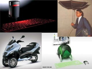 El documento resume varios inventos del siglo XXI como la nanotecnología, el teclado virtual, el robot aspiradora Roomba, el robot PaPeRo y las pantallas flexibles. También menciona otros inventos futuros como exoesqueletos, trenes súper rápidos, lentes con realidad aumentada y una capa de invisibilidad.