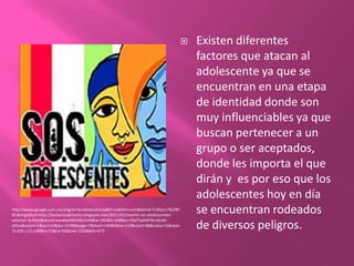 Los adolescentes enfrentan diversos retos durante esta etapa debido a que buscan pertenecer a un grupo e influenciados por el qué dirán. Esto los expone a peligros como iniciar una vida sexual activa sin considerar consecuencias, caer en adicciones como drogas y alcohol, y tener concepciones erróneas del noviazgo que pueden llevar a problemas como embarazos no deseados. Es importante informar a los adolescentes sobre estos riesgos para apoyar su desarrollo hacia una sociedad mejor.