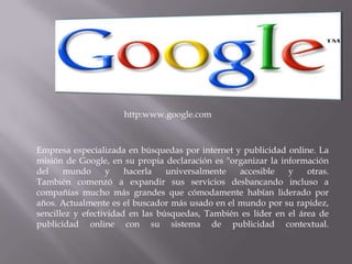 El documento describe diferentes buscadores de internet, incluyendo Google, Yahoo, SearchMash, WikiaSearch, AltaVista, Accoona, A-9, Ask, Scroogle, Gennio y Chacha. Proporciona una breve descripción de cada buscador, destacando sus características y servicios principales.