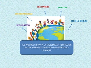 Este documento describe diferentes tipos de valores como la justicia, la honestidad y la responsabilidad que conducen al desarrollo humano y la excelencia. Explica que los valores morales perfeccionan al ser humano y lo forman como una buena persona, mientras que vivir en la mentira o ser violento lo degradan. Además, clasifica los valores en biológicos, económicos, estéticos, sensibles, intelectuales, morales y religiosos, y señala que orientan el comportamiento humano.