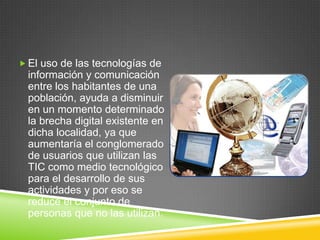 El documento habla sobre las tecnologías de la información y la comunicación (TIC), que agrupan elementos y técnicas usadas para procesar y transmitir información, principalmente informática, internet y telecomunicaciones. El uso de las TIC entre los habitantes de una población puede ayudar a disminuir la brecha digital existente al aumentar el número de usuarios que las utilizan para sus actividades.