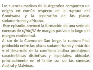 Las cuencas marinas de Argentina comparten un origen común relacionado con la ruptura de Gondwana y la separación de las placas sudamericana y africana, lo que provocó la formación de cuencas de rift a lo largo del margen continental. Al sur de la Cuenca de San Jorge, la ruptura final entre las placas sudamericana y antártica y el desarrollo de los Andes produjeron características distintivas en las cuencas Austral y Malvinas, principalmente en su límite sur.