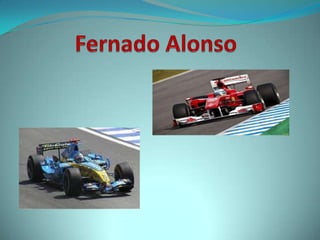 Este documento presenta la biografía y carrera de Fernando Alonso en 8 diapositivas. Detalla su inicio en el karting a los 3 años y sus éxitos tempranos, su ascenso a través de las fórmulas inferiores, su debut en F1 con Minardi en 2001 y sus campeonatos mundiales con Renault en 2005 y 2006. Resume brevemente su paso por McLaren, Renault y Ferrari, y ofrece datos sobre sus logros, vida personal y la popularidad que generó en España conocida como la "Alonsomanía".