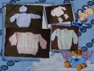 Este documento proporciona instrucciones para tejer chambritas, pantalones y gorras de bebé en punto derecho y revés. Explica los materiales necesarios como lana y agujas, y los pasos a seguir como crear 64 puntos, tejer 4 cm de puntada resorte alternando puntos derechos y revés, y aumentar o disminuir puntos para diferentes secciones de la prenda.