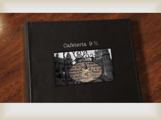 El documento presenta la lista de nombres de los estudiantes que participaron en el proyecto de la cafetería 9 3/4, el logotipo de la cafetería, su misión de alimentar, deleitar y servir a su mundo, su visión de ser una empresa líder y proveedora preferida para 2015, su ubicación cerca de la Prepa 7 Puentes en San Nicolás de los Garza, su página web Plataforma1934.blogspot.com, y el audio y pauta de 15 segundos que invita a conocer la cafetería donde se ofrecen los