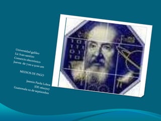 El documento habla sobre el dinero electrónico o digital. Explica que es dinero que se intercambia de forma electrónica a través de redes de ordenadores e Internet, y que incluye transferencias electrónicas de fondos y depósitos directos. También menciona el dinero electrónico anónimo fuera de línea que permite a comerciantes aceptar pagos sin interactuar primero con un banco. Luego discute medios de pago para el comercio electrónico y cómo se utilizan claves simétricas y asimétricas para autent