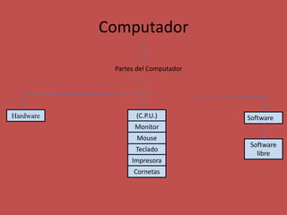 Este documento presenta una introducción a los conceptos básicos de computación e Internet. Brevemente describe las partes principales de una computadora como la CPU, monitor, teclado e impresora. Luego cubre temas como software libre, seguridad informática y virus. Finalmente, resume los tipos y características de redes como LAN, WAN y Mesh, así como los principales servicios e Internet como correo electrónico, redes sociales y navegadores web.