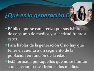 La generación C se caracteriza por crear, producir y participar activamente con los medios usando nuevas tecnologías como los moblogs. Esto plantea nuevos retos pero también oportunidades para los medios, ya que los ciudadanos ahora juegan un papel más importante en recopilar y distribuir información. Los fenómenos como los moblogs, que permiten compartir fotos instantáneamente, afectarán la recopilación y distribución de noticias en la era digital.