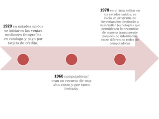 El documento presenta una línea de tiempo del desarrollo del comercio electrónico desde 1920 hasta 2014, destacando hitos tecnológicos como el uso de catálogos y tarjetas de crédito en 1920, el desarrollo de computadoras en la década de 1960, la creación de Internet en la década de 1970, y el surgimiento de la World Wide Web y el comercio en línea en la década de 1990. El comercio electrónico ha crecido considerablemente desde entonces debido a factores como la accesibilidad y facilidad de uso