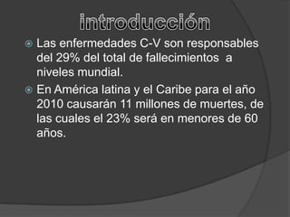 Las enfermedades cardiovasculares causan el 29% de las muertes a nivel mundial y para el año 2010 causarán 11 millones de muertes en América Latina y el Caribe, de las cuales el 23% será en menores de 60 años. Los principales factores de riesgo son la hipertensión arterial, la diabetes, el sedentarismo, el estrés, la obesidad, el tabaquismo y la dislipemia. Los objetivos generales son la promoción de la salud y prevención de enfermedades cardiovasculares, mientras que