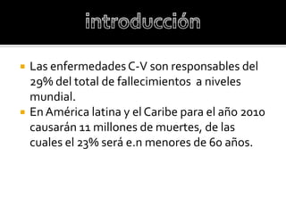 Las enfermedades cardiovasculares son responsables del 29% de las muertes a nivel mundial y causarán 11 millones de muertes en América Latina y el Caribe para el año 2010, de las cuales el 23% ocurrirán en personas menores de 60 años.