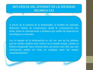 Este documento analiza la influencia de Internet en la sociedad del siglo XXI. Explica que Internet ha revolucionado la forma en que las personas se comunican y comparten información a nivel global. Se ha convertido en el medio de comunicación más extendido en la historia y ha cambiado la forma en que las personas interactúan y obtienen conocimiento. Aunque ha facilitado el acceso a la información, también ha dado lugar a una comunicación más impersonal entre las personas.