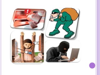 El documento habla sobre los delitos informáticos o crímenes electrónicos que se cometen a través de Internet, como fraude, robo y chantaje. Estos crímenes también incluyen la destrucción y daño de ordenadores, medios electrónicos y redes de Internet. Algunos ejemplos específicos de delitos informáticos mencionados son el spam, fraude y contenido obsceno u ofensivo.