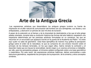 Las expresiones artísticas griegas se desarrollaron durante casi 1000 años y estuvieron inspiradas en la comunicación entre humanos y dioses. El arte griego siempre respetó principios como la proporción y simetría basados en la percepción griega del orden geométrico y matemático del universo. La arquitectura, escultura y cerámica fueron campos importantes donde se aplicaron estos principios artísticos.