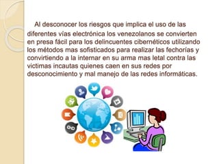 El documento describe los delitos informáticos como acciones ilícitas llevadas a cabo por medios electrónicos para perjudicar a personas, empresas y redes. Explica que los venezolanos son vulnerables debido al desconocimiento de los riesgos de Internet y que los delincuentes usan métodos sofisticados. Define los delitos informáticos como aquellos que destruyen o dañan computadoras, medios electrónicos y redes de Internet.