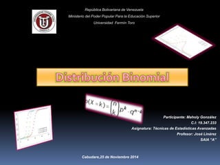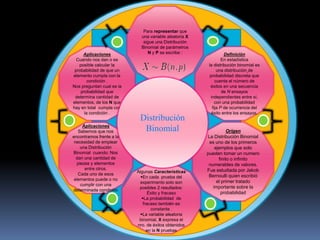 Este documento resume las características de la distribución binomial. Explica que la distribución binomial cuenta el número de éxitos en una secuencia de N ensayos independientes con una probabilidad fija P de éxito. Fue estudiada por Jakob Bernoulli y se usa cuando hay una cantidad finita de elementos que pueden cumplir o no una condición con una probabilidad conocida.