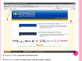 El documento proporciona instrucciones sobre cómo acceder al aula virtual y correo institucional de una universidad. Indica los pasos para ingresar al sistema, actualizar la información personal, acceder a cursos específicos, participar en foros, enviar archivos, comunicarse con tutores, configurar la cuenta de correo y unirse a grupos.
