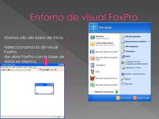 Visual FoxPro es un entorno de desarrollo que se abre desde la barra de inicio de Windows y permite crear bases de datos vacías o proyectos mediante la creación de una carpeta con un nombre asignado. Los archivos generados por Visual FoxPro utilizan extensiones específicas y el programa trabaja con diferentes tipos de datos.