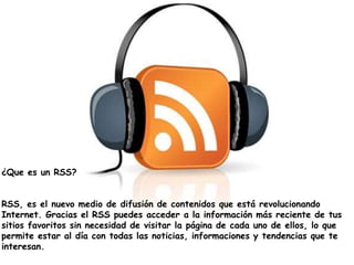 RSS es un medio para distribuir contenido de sitios web que permite a los usuarios acceder a la información más reciente de sus sitios favoritos sin visitar cada página individualmente. Los lectores RSS revisan los feeds de sitios suscritos y notifican a los usuarios sobre nuevos contenidos, ahorrándoles tiempo en la lectura de noticias actualizadas de manera automática. RSS facilita la gestión y publicación de información en la web de una forma estandarizada y eficiente.