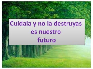 El documento trata sobre la importancia de cuidar la naturaleza y no destruirla porque es nuestro futuro. Explica que la contaminación y mala gestión de los recursos naturales están degradando el medio ambiente y creando problemas a nivel global. También señala que tanto individuos como industrias son responsables de la contaminación y que es necesario encontrar formas más sostenibles de obtener energía para proteger el aire, tierra y agua.