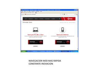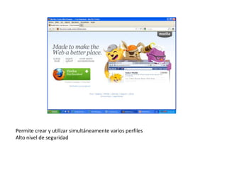 Este documento describe las características y capacidades de un navegador web, incluyendo permitir múltiples perfiles de usuario, seguridad, navegación rápida, innovación constante, velocidad ultra rápida, claridad y eficiencia, popularidad, facilidad de uso, cortar comunicación con servidores sin perder datos, usar gráficos JPEG, personalizar etiquetas de ventanas, cargar y guardar sesiones de trabajo, ser complemento indispensable para Mac OS X, alto rendimiento, soporte de estándares, ser el navegador más