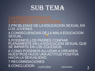 El documento discute la educación sexual, incluyendo los valores de la sexualidad, los problemas de la educación sexual en los jóvenes y las consecuencias de una mala educación sexual. También explora cómo los padres pueden ayudar a crear una actitud positiva hacia la sexualidad en sus hijos y ofrece recomendaciones para la educación sexual.