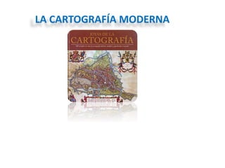 La cartografía moderna es la ciencia que se encarga de representar gráficamente medidas y datos de regiones de la Tierra. Tiene su origen en los primeros mapas rudimentarios pero ha evolucionado gracias a avances tecnológicos como fotografía aérea, sensores remotos, computadoras y GPS. Los mapas modernos proporcionan información precisa sobre elementos de la superficie terrestre y han sido desarrollados por importantes cartógrafos a lo largo de la historia como Tales de Mileto, Ptolomeo y Estrabón.
