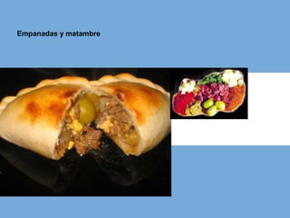 Este documento presenta algunas comidas y bebidas típicas de 1810 en Argentina. Entre las comidas se mencionan sándwiches de miga mixtos, empanadas rellenas de carne, aceitunas y huevo duro, asado con carne de res, cerdo y chorizo, y locro hecho con maíz, panceta y calabaza. Las bebidas incluyen mate, aguardiente obtenido por destilación de mostos o pastas fermentadas, y vino.