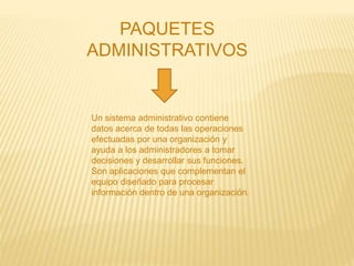 Este documento resume los tipos principales de paquetes administrativos y sus características. Los paquetes administrativos son aplicaciones que ayudan a los administradores a tomar decisiones mediante el procesamiento y análisis de información de una organización. Algunos tipos clave son los paquetes administrativos, financieros y fiscales, cada uno diseñado para proporcionar información y control sobre diferentes funciones organizacionales como la planificación, las finanzas y el cumplimiento de obligaciones tributarias.