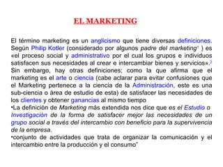El marketing se define como el proceso social y administrativo mediante el cual grupos e individuos satisfacen sus necesidades a través de la creación e intercambio de bienes y servicios. Existen varias clases de marketing, incluyendo el marketing sectorial, directo, virtual y relacional. Los procesos de marketing involucran tomar conocimiento de una empresa, considerar sus productos, convertirse en cliente ocasional y eventualmente en cliente habitual a través del establecimiento de relaciones y la adición de valor.