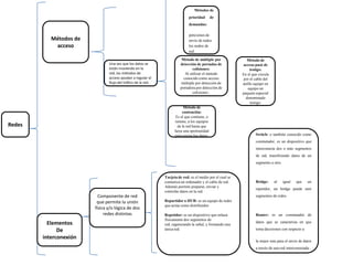 El documento describe diferentes métodos de acceso y elementos de interconexión en redes. Explica métodos de acceso como múltiple por detección de portadoras de colisiones y método de contención. También describe elementos de interconexión como switch, tarjeta de red, bridge, repetidor, router y repartidor.