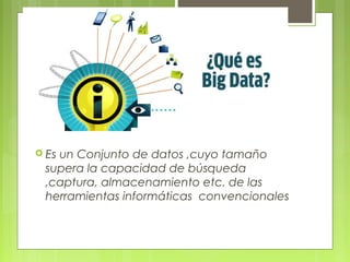 El documento describe Big Data y su aplicación al turismo. Big Data se refiere a grandes conjuntos de datos que superan la capacidad de procesamiento convencional debido a su variedad, velocidad, volumen y valor. El objetivo de Big Data es almacenar, procesar y analizar grandes cantidades de datos de manera económica y flexible. En el turismo, Big Data puede ayudar a entender mejor los hábitos de los turistas y gestionar de forma más eficiente los recursos, especialmente en destinos turísticos inteligentes que integran datos de m