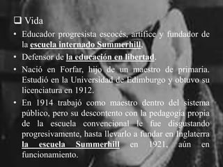 Este documento resume la vida y filosofía educativa de Alexander Sutherland Neill, educador escocés que fundó la escuela Summerhill en 1921. Neill creía firmemente en la educación en libertad y se oponía a la competitividad y represión impuestas en las escuelas convencionales. Bajo su liderazgo, Summerhill se convirtió en una de las primeras escuelas democráticas, donde los niños aprenden mejor cuando son libres de coerción y pueden elegir libremente sus propias actividades.